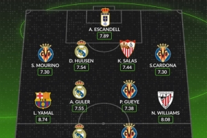 中场:亚马尔(巴萨,8.74分)、居勒尔(皇马,7.55分)、帕佩-盖耶(黄潜,7.38分)、尼科-威廉姆斯(毕巴,8.08分)