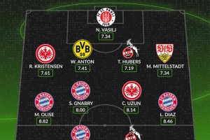后卫:R-克里斯滕森(法兰克福,7.61分)、安东(多特,7.41分)、蒂莫-许伯斯(科隆,7.19分)、米特尔施塔特(斯图加特,7.34分)