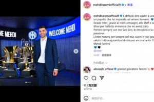“国际米兰将永远留在我心中。带着感激之情,我向你们所有人告别,并祝愿你们未来赢得更多荣誉!满怀感情地这么做。——梅赫迪-塔雷米。”