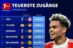 体育资讯9月4日讯 德甲夏窗已经截止,《转会市场》也统计了德甲今夏的最贵引援榜,路易斯-迪亚斯断崖领跑。