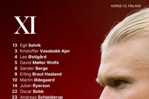 挪威首发:13-塞尔维克、3-阿耶尔、4-厄斯蒂高、5-戴维-沃尔费、8-桑德-博格、9-哈兰德、10-厄德高、14-莱尔森、22-奥斯卡-鲍勃、23-施耶尔德鲁普、24-米赫埃