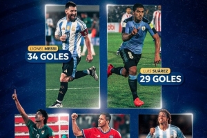 体育资讯9月5日讯 南美足联官方列出了南美世预赛历史射手榜,梅西34球居首,苏亚雷斯29球次席。