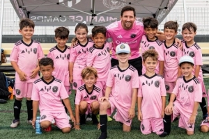 梅西出席迈阿密国际青训学院的活动,与小球员互动,为他们签名并合影。