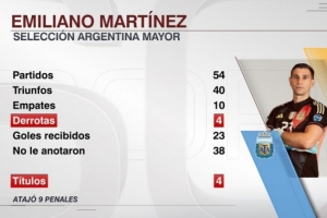 据ESPN统计,大马丁为阿根廷国家队出战54场比赛,仅输掉其中4场。
