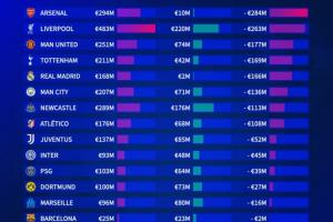 此外,巴萨、切尔西、米兰等队实现了盈利,法兰克福盈利了6900万欧。