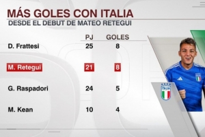 据ESPN统计,雷特吉意大利队首秀以来打进8球,与弗拉泰西并列同期队内进球最多。