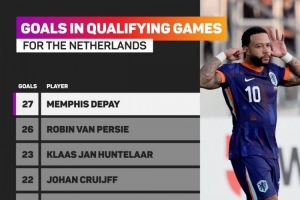 体育资讯9月8日讯 世预赛欧洲区比赛,德佩梅开二度,帮助荷兰客场3-2击败立陶宛。Opta列出了荷兰队史预选赛(世预赛+欧预赛)射手榜,德佩以27球居首。