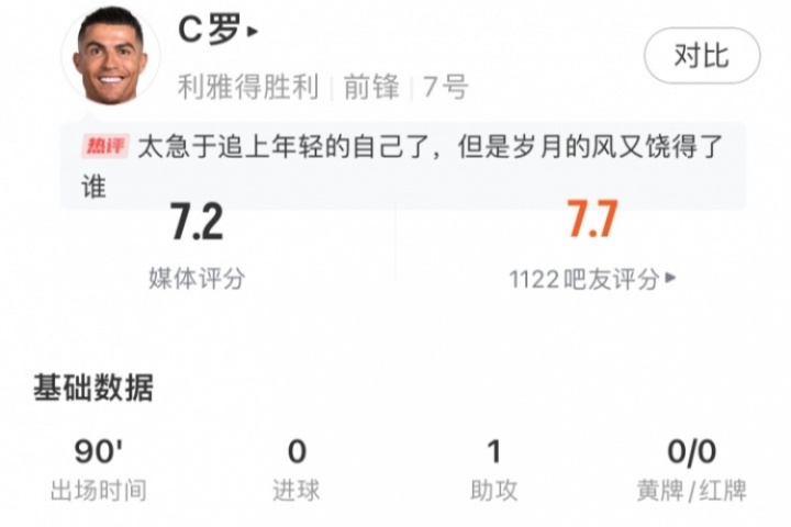 C罗本场比赛首发出战90分钟,贡献一次助攻。