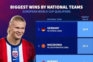体育资讯9月10日讯 世预赛欧洲区比赛,挪威主场11-1击败摩尔多瓦,据德国转会市场统计,这是欧洲世预赛历史第二大比分胜利,仅次于德国12-0塞浦路斯。