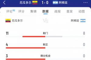 此役梅西缺阵,阿根廷队全场8次射门0射正0得分机会,厄瓜多尔11次射门4次射正,凭借瓦伦西亚的点球拿下胜利。