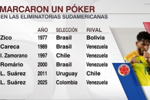 体育资讯9月10日讯 在本轮南美区世预赛哥伦比亚6-3击败委内瑞拉的比赛中,苏亚雷斯上演大四喜,成为赛事历史第6位做到这一点的球员,具体如下: