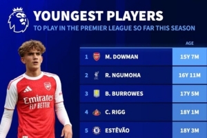 体育资讯9月13日讯 德转列本赛季英超截止目前出场最年轻球员排行,道曼15岁7个月最年轻,恩古莫哈第二。