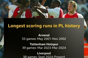 体育资讯9月15日讯 在本轮英超,利物浦1-0击败伯恩利,延续了球队连续进球场次纪录。以下为英超历史连场破门纪录榜: