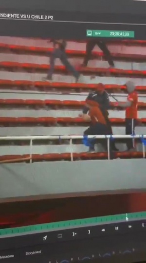 有智利大学的球迷从看台高处坠落,这一画面引起了极大的恐慌和担忧,尚不清楚他是被推的还是在试图逃离时失足坠落。