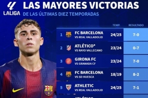 体育资讯9月15日讯 西甲第4轮比赛,巴萨在主场以6-0的比分大胜瓦伦西亚。今年1月,红蓝军团曾以7-1的比分大胜同样的对手。德国转会市场盘点了西甲最大比分赢球top10,巴萨5次上榜。