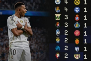 Sofascore也盘点了姆巴佩皇马生涯50球的分布,其中对阵巴萨打进5球最多,对阵曼城、塞尔塔、皇家社会均是打进4球,对阵巴拉多利德、莱加内斯打进3球,此外对阵亚特兰大等球队打进2球。
