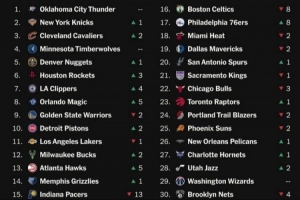 体育资讯8月21日讯 今年休赛期,美媒The Athletic公布了他们的NBA球队实力排名,雷霆、尼克斯、骑士前三。