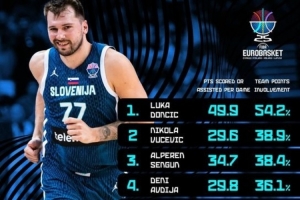 体育资讯9月21日讯 欧锦赛官方发布了本次赛事得分+助攻得分占全队总分比重的前十,具体如下: