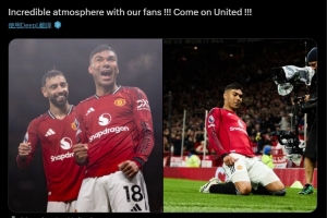卡塞米罗晒出自己的赛场照,并配文:球迷们营造的氛围简直太棒了!!!加油曼联!!!