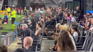 苏亚雷斯被禁赛坐在看台上,帮球队老板豪尔赫-马斯泡马黛茶,后者则在认真看比赛。