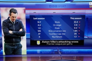 这是维拉本赛季5轮英超打进的唯一进球,BBC也盘点了维拉本赛季英超相较上赛季的场均进攻数据,可谓全面下滑,具体如下: