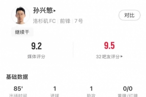 体育资讯9月22日讯 美职联,洛杉机FC4比1击败皇家盐湖城。孙兴慜首发出战,85分钟被替换下场,贡献1球1助。赛后评分9.5。
