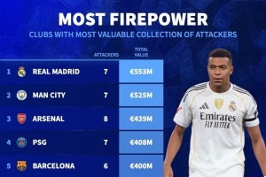 体育资讯9月23日讯 德国转会市场统计了各家俱乐部锋线球员的身价,并列出锋线总价榜单,皇马5.53亿欧居首,曼城、阿森纳二三位。