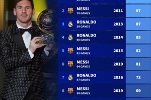 体育资讯9月24日讯 2025年金球奖评选结果出炉,巴黎圣日耳曼边锋登贝莱夺魁。曾几何时,梅西和C罗主宰了金球奖的评选,两人之间的竞争成为足坛令人津津乐道的话题。德国转会市场盘点了2000年以来金球奖得主直接参与进球情况,梅西2012年69场117球居首。