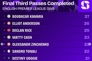 体育资讯9月24日讯 英超第5轮战罢,squawkafootball列各项数据排行,维拉中场布巴卡尔-卡马拉是在进攻三区完成传球最多的球员,共27次。