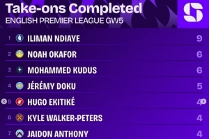 体育资讯9月24日讯 英超第5轮战罢,squawkafootball列各项数据排行,埃弗顿边锋恩迪亚耶是完成过人最多的球员,共9次。