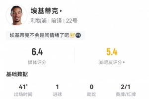 体育资讯9月24日讯 联赛杯第三轮,利物浦2-1南安普顿。此役埃基蒂克替补登场41分钟,球员全场重点数据如下↓
