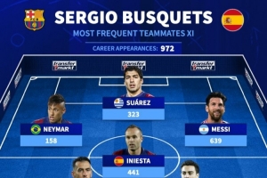 体育资讯9月26日讯 西班牙中场布斯克茨今日宣布赛季结束后退役,德转评出在布斯克茨截止目前的职业生涯中,最常搭档的11人阵容。其中梅西639场居首,皮克605场第二。布斯克斯本人目前职业生涯出场次数972场。
