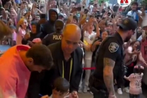 《马卡报》社媒晒出视频,众多球迷在酒店外等候梅西,并高喊他的名字,《马卡报》配文:“美国为梅西疯狂。”