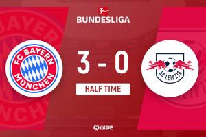 上半场伤停补时4分钟,半场结束,拜仁暂3-0莱比锡。