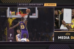 主持人邀请詹姆斯对自己湖人生涯的几大隔扣打分(10分制)。)