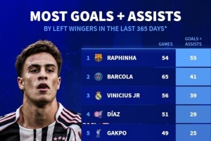 五大联赛左边锋近一年参与进球榜(所有赛事):