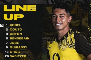 多特首发:1-科贝尔、39-菲利波-马内、3-安东、5-本塞拜尼、2-扬-库托、13-格罗斯、20-萨比策、7-小贝林厄姆、24-斯文松、9-吉拉西、27-阿德耶米