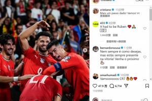 C罗社媒晒出与队友们一起庆祝的照片,并配文:“又迈出一步!加油!”