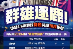 第25194期传足4/6场游戏特色奖期已经于2025年10月12日20:00开售,将于2025年10月14日22:00停售,并于10月15日开奖,其中卡塔尔VS阿联酋、葡萄牙VS匈牙利、西班牙VS保加利亚和沙特VS伊拉克为4场进球游戏竞猜赛事。