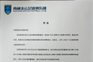 欣闻贵俱乐部以出色的赛场表现提前一轮锁定2025赛季中乙联赛冲甲席位,值此欢庆时刻,南通支云足球俱乐部谨向贵俱乐部全体教练员、运动员、工作人员及广大无锡球迷致以最诚挚的祝贺!