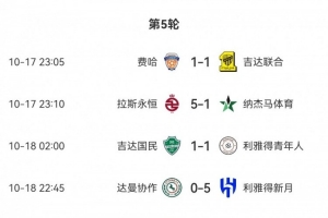 体育资讯10月20日讯 沙特联第五轮,共有40粒进球产生,仅利雅得新月完成零封。