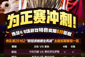 第25162期传足4/6场游戏特色奖期已经于2025年8月24日20:00开售,将于2025年8月27日22:00停售,并于8月28日开奖,其中卡拉巴赫VS费伦茨瓦罗斯、本菲卡VS费内巴切、布鲁日VS格拉斯哥流浪者、哥本哈根VS巴塞尔为4场进球游戏竞猜赛事。