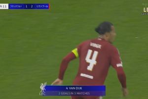 体育资讯10月23日讯 4分钟2球!范戴克第37分钟头球冲顶破门,利物浦2-1法兰克福