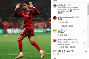 埃基蒂克攻破老东家球门后没有庆祝,他在社交媒体上晒出比赛照片,配文:“能够回到这里真是太好了(上天的恩赐),感谢你们的爱,祝一切顺利。”