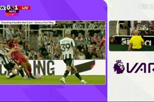 VAR介入,主裁观看回放,判罚红牌。