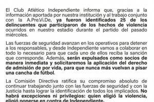 “安全部门正在采取行动逮捕这些责任人,而独立竞技俱乐部将全力配合,确保每个人受到应有的惩罚。此外,这些人将立即被取消会员资格,并请求永久禁止他们进入足球场。”