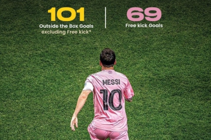 据统计,这是梅西生涯第101粒禁区外运动战进球,历史第一。此外梅西生涯目前还进了69个任意球。