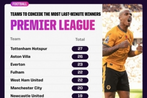 体育资讯8月27日讯 在英超历史上,有一些球队经常会成为最后一分钟被绝杀的背景板。OPTA盘点了英超历史最后一分钟被绝杀次数最多球队top10,热刺27次居首。