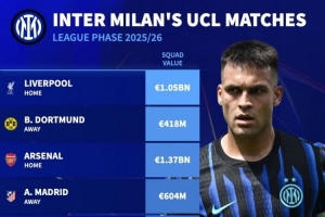 体育资讯8月29日讯 本赛季欧冠联赛阶段对阵抽签结果出炉,德国转会市场盘点了国米对手的身价。