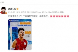 周琦更新个人微博,欢迎赵睿的到来,写道:“村里来新人了!二年级新生欢迎一年级新生。”
